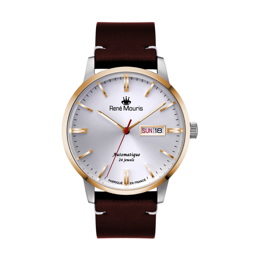 To honour the classic watch making, Noblesse collection features a simple and clear dial index while reinterpret them with an elegant modernity and a stiff sapphire glass to withstand daily scratches. This Noblesse collection is not like most of Rene Mouris collections, it offers a pair of gents and ladies sizes which is ideal wrist watch for matching couple outfit. Silver-tone stainless steel case with a brown leather strap. Fixed rose gold-tone stainless steel bezel. White dial with rose gold-tone hands and index hour markers. Minute scale around the inner rim. Dial Type: Analog. Luminescent hands. Day of the week and date display at the 3 o'clock position. Automatic movement. Scratch resistant sapphire crystal. Pull / push crown. Transparent case back. Round case shape, case size: 41 mm, case thickness: 12 mm. Band width: 20 mm, band length: 8.68 inches. Buckle clasp. Water resistant at 100 meters / 330 feet. Functions: date, day, hour, minute, second. Noblesse Series. Dress watch style. Watch label: French Made, Japan Movt. Rene Mouris Noblesse Automatic White Dial Mens Watch 10105RM3.