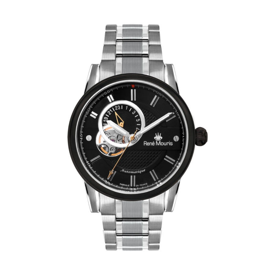 Silver-tone stainless steel case and bracelet. Fixed black stainless steel bezel. Black dial with silver-tone hands and index hour markers. Minute scale around the inner rim. Dial Type: Analog. Luminescent hands. 24 hour subdials. Automatic movement. Scratch resistant mineral crystal. Pull / push crown. Transparent case back. Round case shape, case size: 44 mm, case thickness: 13 mm. Band width: 22 mm, band length: 8.07 inches. Deployment with push button release clasp. Water resistant at 100 meters / 330 feet. Functions: hour, minute, second. Orion Series. Luxury watch style. Watch label: French Made, Japan Movt. Rene Mouris Orion Automatic Black Dial Mens Watch 70102RM2.