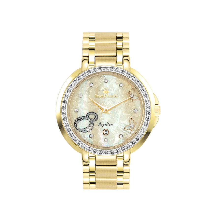 The design of Papillon collection is inspired by the beauty of nature. It is adorned with 46 pieces of crystals on the bezel, crystals hour markers, an arabic numeral at 8 o’clock, and butterfly patterns etched onto a mother-of-pearl dial. Yellow gold-tone stainless steel case and bracelet. Fixed yellow gold-tone stainless steel bezel. Mother of pearl dial with yellow gold-tone hands and Arabic numeral & index hour markers. Dial Type: Analog. Date display at the 6 o'clock position. Quartz movement. Scratch resistant mineral crystal. Pull / push crown. Solid case back. Round case shape, case size: 36 mm, case thickness: 7.3 mm. Band width: 17 mm, band length: 7.4 inches. Deployment with push button release clasp. Water resistant at 30 meters / 100 feet. Functions: date, hour, minute. Additional Info: 46 pieces of crystal on bezel. Papillon Series. Fashion watch style. Rene Mouris Papillon Mother of Pearl Dial Ladies Watch 50111RM6.