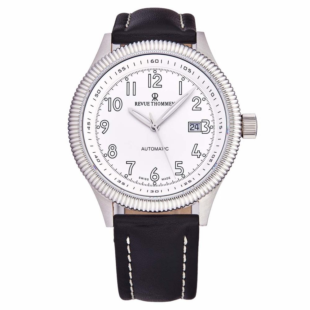 Silver-tone stainless steel case with a black leather strap. Fixed silver-tone stainless steel bezel. Silver dial with silver-tone hands and Arabic numeral hour markers. Minute markers around the outer rim. Dial Type: Analog. Luminescent hands. Date display at the 3 o'clock position. Sellita Caliber SW200 Automatic movement, containing 26 Jewels, bitting at 28800 vph, and has a power reserve of approximately 38 hours. Scratch resistant sapphire crystal. Pull / push crown. Solid case back. Round case shape, case size: 44 mm. Pin buckle clasp. Water resistant at 100 meters / 330 feet. Functions: date, hour, minute, second. Airspeed Vintage Series. Casual watch style. Watch label: Swiss Made. Revue Thommen Airspeed Vintage Automatic Silver Dial Mens Watch 17060.2522.