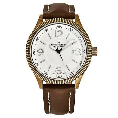 Vintage PVD plating stainless steel case with a brown leather strap. Fixed bronze PVD plating bezel. Silver dial with luminous silver-tone hands and index hour markers. Arabvic numerals appear at the 3, 6, 9 and 12 o'clock positions. Minute markers. Arabic numeral minute markers (at 5 minute intervals) around the outer rim. Dial Type: Analog. Luminescent hands and markers. Date display at the 3 o'clock position. Sellita caliber SW 200 automatic movement, based upon ETA 2824-2, containing 26 Jewels, bitting at 28800 vph, and has a power reserve of approximately 38 hours. Scratch resistant sapphire crystal. Screw down crown. Solid case back. Round case shape. Case size: 44.5 mm. Case thickness: 11.3 mm. Band width: 20 mm. Tang clasp. Water resistant at 100 meters / 330 feet. Functions: date, hour, minute, second. Airspeed Vintage Series. Casual watch style. Watch label: Swiss Made. Revue Thommen Airspeed Vintage Automatic Silver Dial Mens Watch 17060.2588.