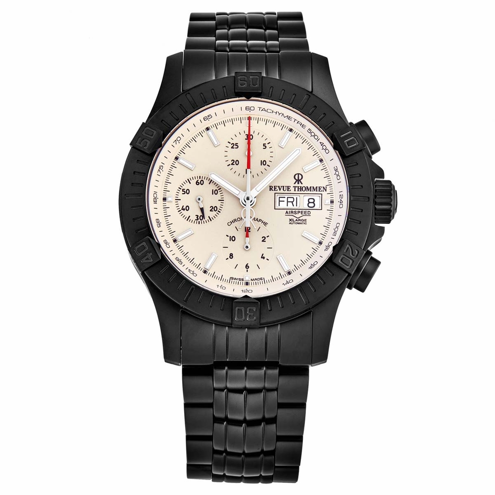 Black PVD stainless steel case with a black stainless steel bracelet. Uni-directional black PVD stainless steel bezel. Silver dial with silver-tone hands and index hour markers. Tachymeter scale around the outer rim. Dial Type: Analog. Luminescent hands and markers. Day of the week and date display at the 3 o'clock position. Chronograph - sub-dials displaying: chrono 30 minute counter at 12 o'clock, 12 hour counter at 6 o'clock, small seconds at 9 o'clock. ETA-Valjoux Caliber 7750 Automatic movement, containing 25 Jewels, bitting at 28800 vph, and has a power reserve of approximately 44 hours. Scratch resistant sapphire crystal. Screw down crown. Transparent see through case back. Round case shape, case size: 43.5 mm, case thickness: 15.6 mm. Band width: 22 mm, band length: 8 inches. Deployment clasp. Water resistant at 100 meters / 330 feet. Functions: hour, minute, second, day-date, chronograph, tachymeter. Airspeed Xlarge Pioneer Series. Sport watch style. Watch label: Swiss Made. Revue Thommen Airspeed XLarge Pioneer Chronograph Automatic Silver Dial Mens Watch 16071.6178.