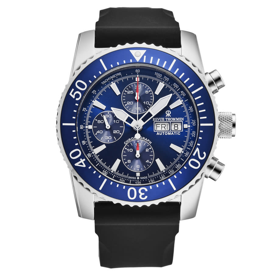 Silver-tone stainless steel case with a black rubber strap. Uni-directional rotating blue stainless steel bezel. Blue dial with silver-tone hands and index hour markers. Minute markers around the outer rim. Dial Type: Analog. Luminescent hands and markers. Day of the week and date display at the 3 o'clock position. Chronograph - three sub-dials displaying: 60 second, 30 minute and 12 hour. ETA-Valjoux Caliber 7750 Automatic movement, containing 25 Jewels, bitting at 28800 vph, and has a power reserve of approximately 44 hours. Scratch resistant sapphire crystal. Screw down crown. Solid case back. Round case shape, case size: 45 mm, case thickness: 16 mm. Band length: 8 inches. Buckle clasp. Water resistant at 300 meters / 1000 feet. Functions: chronograph, day, date, hour, minute, second. Diver Series. Dive watch style. Watch label: Swiss Made. Revue Thommen Diver Chronograph Automatic Blue Dial Mens Watch 17030.6533.