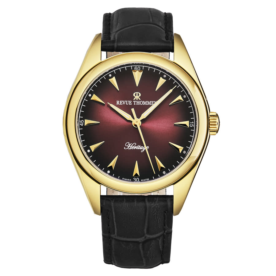 Yellow gold-tone stainless steel case with a black leather strap. Fixed yellow gold-tone stainless steel bezel. Red dial with yellow gold-tone hands and index hour markers. Minute markers around the outer rim. Dial Type: Analog. Luminescent hands and markers. Automatic movement. Scratch resistant sapphire crystal. Pull / push crown. Transparent see through case back. Round case shape, case size: 39 mm, case thickness: 10 mm. Band width: 20 mm, band length: 8 inches. Buckle clasp. Water resistant at 50 meters / 165 feet. Functions: hour, minute, second. Heritage Series. Luxury watch style. Watch label: Swiss Made. Revue Thommen Heritage Automatic Red Dial Mens Watch 21010.2516.