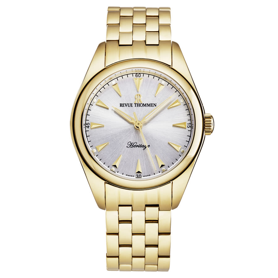 Yellow gold-tone stainless steel case and bracelet. Fixed yellow gold-tone bezel. Silver-tone dial with yellow gold-tone hands and index hour markers. Minute markers around the outer rim. Dial Type: Analog. Automatic movement. Scratch resistant sapphire crystal. Pull / push crown. Transparent case back. Round case shape. Case size: 39 mm. Case thickness: 10 mm. Band width: 18 mm. Band length: 8 inches. Deployment clasp with a push button release. Water resistant at 50 meters / 165 feet. Functions: hour, minute, second. Heritage Series. Luxury watch style. Watch label: Swiss Made. Revue Thommen Heritage Automatic Silver Dial Mens Watch 21010.2112.