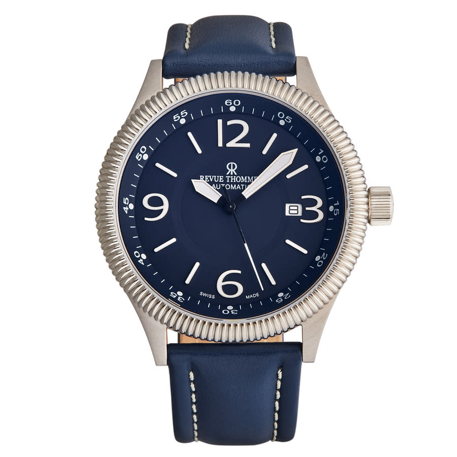 Silver-tone stainless steel case with a blue leather strap. Fixed silver-tone stainless steel bezel. Blue dial with silver-tone hands and Arabic numeral & index hour markers. Minute markers around the outer rim. Dial Type: Analog. Luminescent hands and markers. Date display at the 3 o'clock position. Sellita Caliber SW 200 Automatic movement, based upon ETA 2824-2, containing 26 Jewels, bitting at 28800 vph, and has a power reserve of approximately 38 hours. Scratch resistant sapphire crystal. Pull / push crown. Solid case back. Round case shape, case size: 44.5 mm, case thickness: 11.3 mm. Band width: 22 mm, band length: 8 inches. Buckle clasp. Water resistant at 100 meters / 330 feet. Functions: date, hour, minute, second. Pilot Series. Casual watch style. Watch label: Swiss Made. Revue Thommen Pilot Automatic Blue Dial Mens Watch 17060.2525.