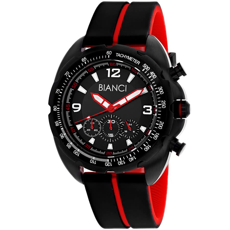 Black stainless steel case with a black silicone strap. Fixed black stainless steel bezel. Black dial with red hands and index hour markers. Minute markers around the outer rim. Dial Type: Analog. Luminescent hands and markers. Chronograph - three sub-dials displaying: 60 second, 30 minute and 24 hour. Quartz movement. Scratch resistant mineral crystal. Round case shape, case size: 43 mm. Band width: 20 mm. Buckle clasp. Water resistant at 100 meters / 330 feet. Functions: chronograph, hour, minute, second. Aberto Series. Fashion watch style. Roberto Bianci Aberto Chronograph Quartz Black Dial Mens Watch RB55061.