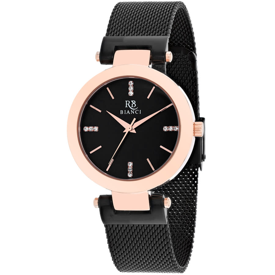 Rose gold-tone stainless steel case with a black stainless steel bracelet. Fixed rose gold-tone stainless steel bezel. Black dial with rose gold-tone hands and index hour markers. Dial Type: Analog. Quartz movement. Scratch resistant mineral crystal. Round case shape, case size: 34 mm. Band width: 18 mm. Jewelry clasp. Water resistant at 30 meters / 100 feet. Functions: hour, minute, second. Cristallo Series. Fashion watch style. Roberto Bianci Cristallo Quartz Black Dial Ladies Watch RB0405.