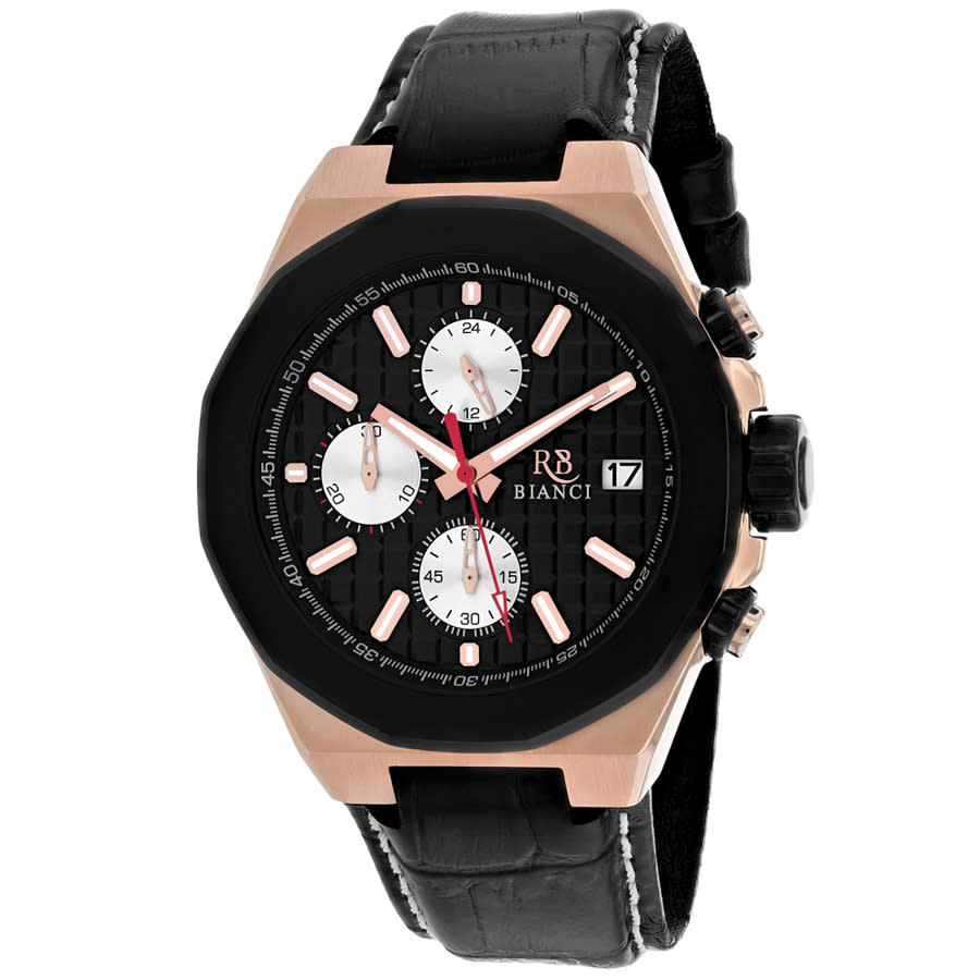 Rose gold-tone stainless steel case with a black leather strap. Fixed black stainless steel bezel. Black dial with rose gold-tone hands and index hour markers. Minute markers around the outer rim. Dial Type: Analog. Luminescent hands and markers. Date display at the 3 o'clock position. Chronograph - three sub-dials displaying: 60 second, 30 minute and 24 hour. Quartz movement. Scratch resistant mineral crystal. Round case shape, case size: 44 mm. Band width: 22 mm. Buckle clasp. Water resistant at 50 meters / 165 feet. Functions: chronograph, date, hour, minute, second. Fratelli Series. Fashion watch style. Roberto Bianci Fratelli Chronograph Quartz Black Dial Mens Watch RB0133.