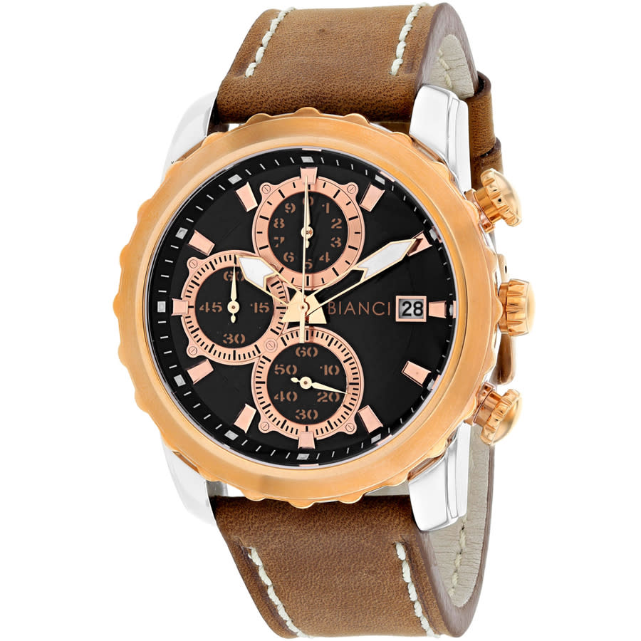 Rose gold-tone stainless steel case with a brown silicone strap. Fixed rose gold-tone stainless steel bezel. Black dial with rose gold-tone hands and index hour markers. Minute markers around the outer rim. Dial Type: Analog. Luminescent hands. Date display at the 3 o'clock position. Quartz movement. Scratch resistant mineral crystal. Round case shape, case size: 46 mm. Band width: 23 mm. Buckle clasp. Water resistant at 100 meters / 330 feet. Functions: chronograph, date, hour, minute, second. Valerio Series. Fashion watch style. Roberto Bianci Valerio Chronograph Quartz Black Dial Mens Watch RB54470.