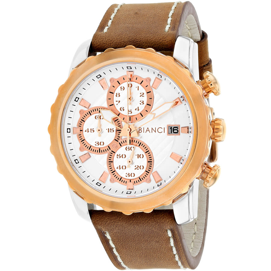 Gold-tone stainless steel case with a brown silicone strap. Gold-tone stainless steel bezel. White dial with silver-tone hands and index hour markers. Minute markers around the outer rim. Dial Type: Analog. Luminescent hands and markers. Date display at the 3 o'clock position. Quartz movement. Scratch resistant mineral crystal. Pull / push crown. Solid case back. Round case shape, case size: 46 mm. Band width: 23 mm. Buckle clasp. Water resistant at 100 meters / 330 feet. Functions: chronograph, date, hour, minute, second. Valerio Series. Fashion watch style. Roberto Bianci Valerio Chronograph Quartz White Dial Mens Watch RB54471.