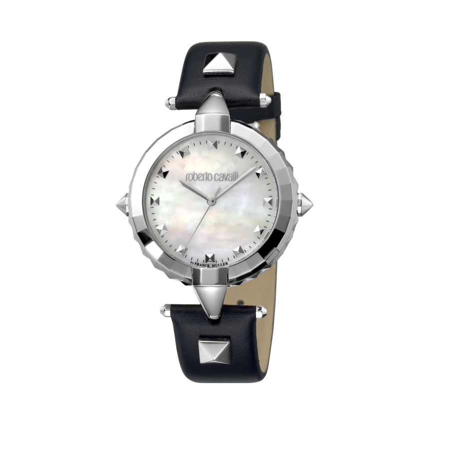 Silver-tone stainless steel case with a black leather strap. Fixed silver-tone bezel. Mother of pearl dial with silver-tone hands and index hour markers. Minute markers around the outer rim. Dial Type: Analog. Quartz movement. Scratch resistant sapphire crystal. Pull / push crown. Solid case back. Round case shape. Case size: 34 mm. Band length: 7 inches. Buckle clasp. Water resistant at 50 meters / 165 feet. Functions: hour, minute, second. Fashion watch style. Roberto Cavalli Quartz Ladies Watch RV1L032L0016.
