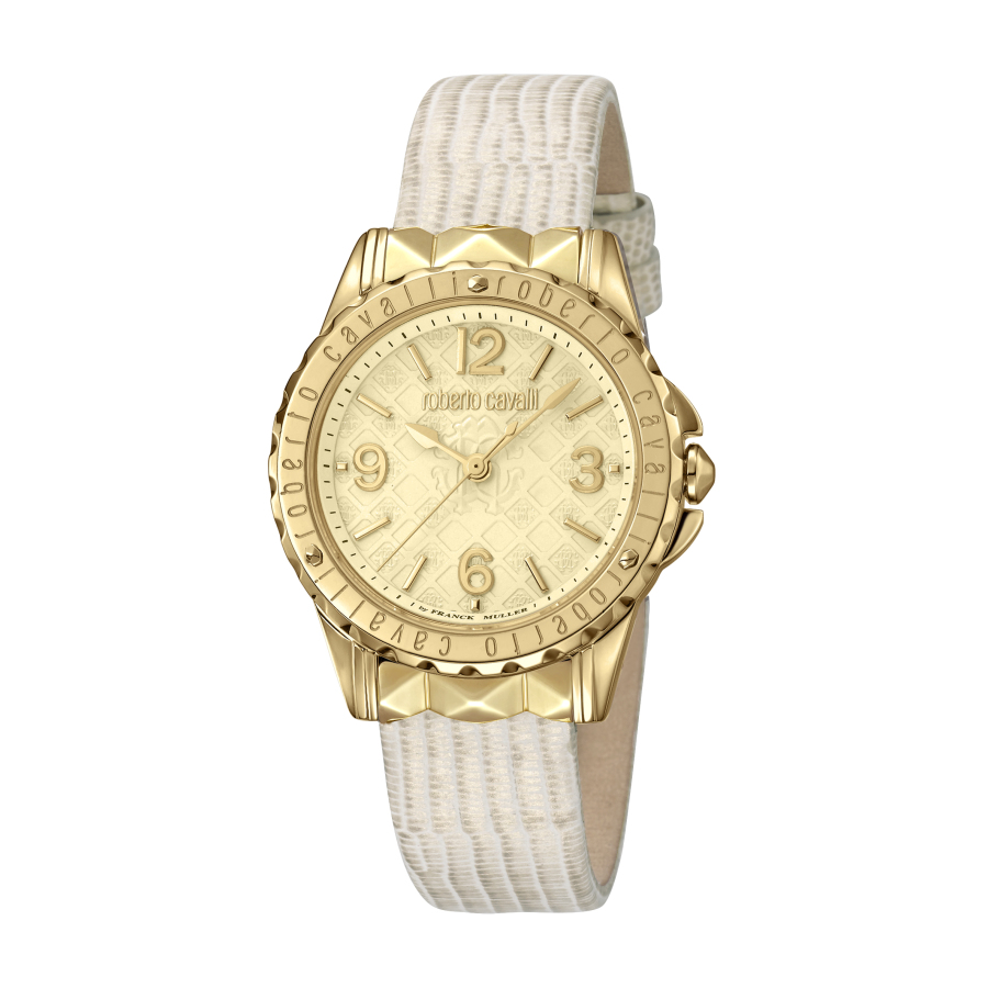 Gold-tone stainless steel case with a beige leather strap. Fixed gold-tone stainless steel bezel. Champagne dial with gold-tone hands and Arabic numeral hour markers. Minute markers around the outer rim. Dial Type: Analog. Ronda 763 quartz movement. Scratch resistant sapphire crystal. Round case shape. Case size: 34 mm. Buckle clasp. Water resistant at 50 meters / 165 feet. Functions: hour, minute, second. Fashion watch style. Roberto Cavalli Classic Quartz Champagne Dial Ladies Watch RV1L048L0036.