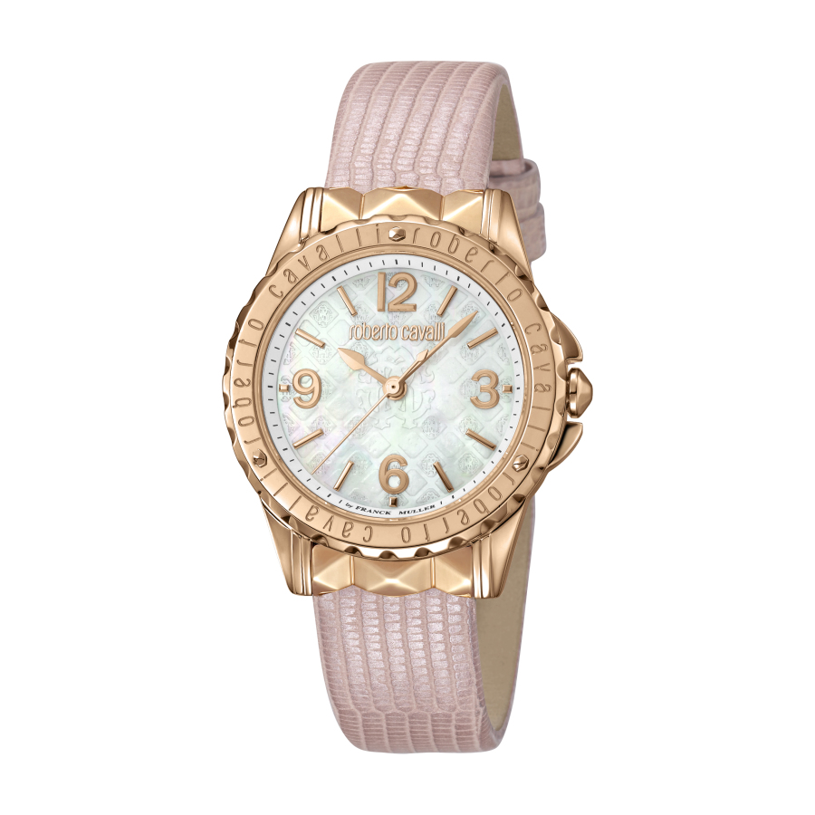 Rose gold-tone stainless steel case with a pink leather strap. Fixed rose gold-tone bezel. White dial with rose gold-tone hands and Arabic numeral hour markers. Minute markers around the outer rim. Dial Type: Analog. Ronda 763 quartz movement. Scratch resistant sapphire crystal. Round case shape. Case size: 34 mm. Buckle clasp. Water resistant at 50 meters / 165 feet. Functions: hour, minute, second. Fashion watch style. Roberto Cavalli Classic Quartz White Dial Ladies Watch RV1L048L0046.