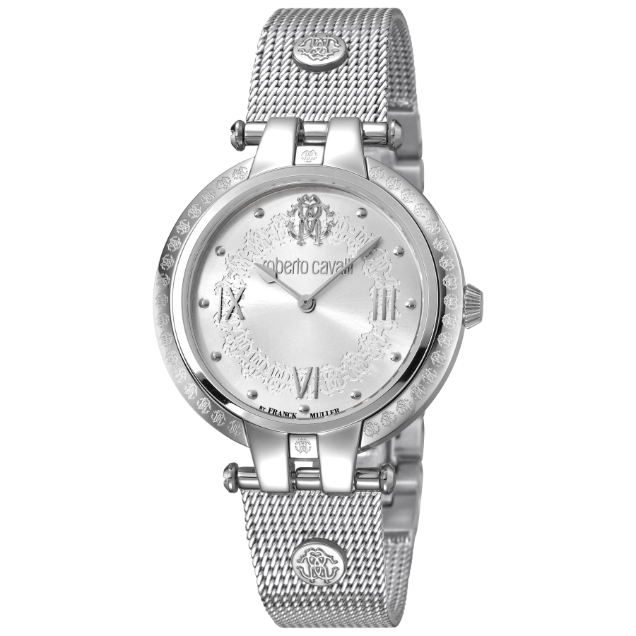 Silver-tone stainless steel case with a silver-tone stainless steel bracelet. Fixed silver-tone bezel. Silver-tone dial with silver-tone hands and Roman numeral & index hour markers. Dial Type: Analog. Ronda 763 quartz movement. Scratch resistant sapphire crystal. Round case shape, case size: 40 mm, case thickness: 10 mm. Band width: 18 mm. Water resistant at 50 meters / 165 feet. Functions: hour, minute. Fashion watch style. Roberto Cavalli Classic Quartz Silver Dial Ladies Watch RV1L053M0056.