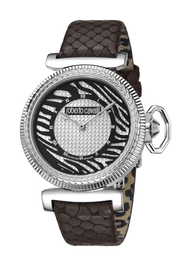Stainless steel case with a brown (calfskin) leather strap. Fixed stainless steel bezel. Black and silver dial with silver-tone hands and Roman numeral hour markers. Dial Type: Analog. Quartz movement. Scratch resistant antireflective sapphire crystal. Pull / push crown. Solid case back. Round case shape. Case size: 38 mm. Case thickness: 10 mm. Band width: 18 mm, band length: 7.5 inches. Deployment clasp. Water resistant at 50 meters / 165 feet. Functions: hour, minute. Casual watch style. Roberto Cavalli Silver Dial Ladies Watch RV1L056L0016.