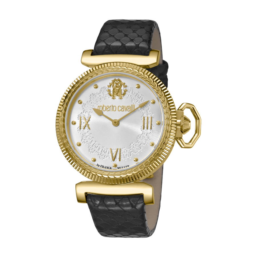 Gold-tone stainless steel case with a black leather strap. Fixed gold-tone bezel. Silver dial with gold-tone hands and dot hour markers. Roman numerals appear at the 3, 6 and 9 o'clock positions. Dial Type: Analog. Ronda caliber 762 quartz movement. Scratch resistant sapphire crystal. Pull / push crown. Solid case back. Round case shape. Case size: 38 mm. Cse thickness: 10 mm. Band width: 18 mm. Tang clasp. Water resistant at 50 meters / 165 feet. Functions: hour, minute. Classic Series. Fashion watch style. Watch label: Swiss Movt. Roberto Cavalli Classic Quartz Silver Dial Ladies Watch RV1L056L0216.