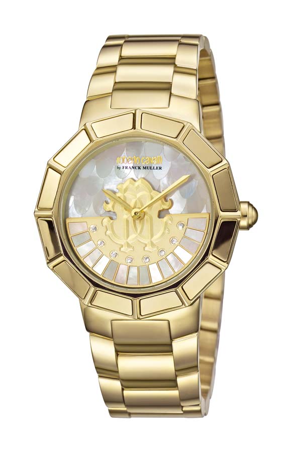Gold-tone stainless steel case with a gold-tone stainless steel bracelet. Fixed gold-tone stainless steel bezel. Champagne dial with gold-tone hands. Dial Type: Analog. Quartz movement. Scratch resistant antireflective sapphire crystal. Push/pull crown. Solid case back. Dodecagon case shape, case size: 37 mm, case thickness: 11 mm. Band length: 7.5 inches. Deployment clasp. Water resistant at 50 meters / 165 feet. Functions: hour, minute. Casual watch style. Roberto Cavalli Rotating Dial Champagne Dial Ladies Watch RV2L011M0086.
