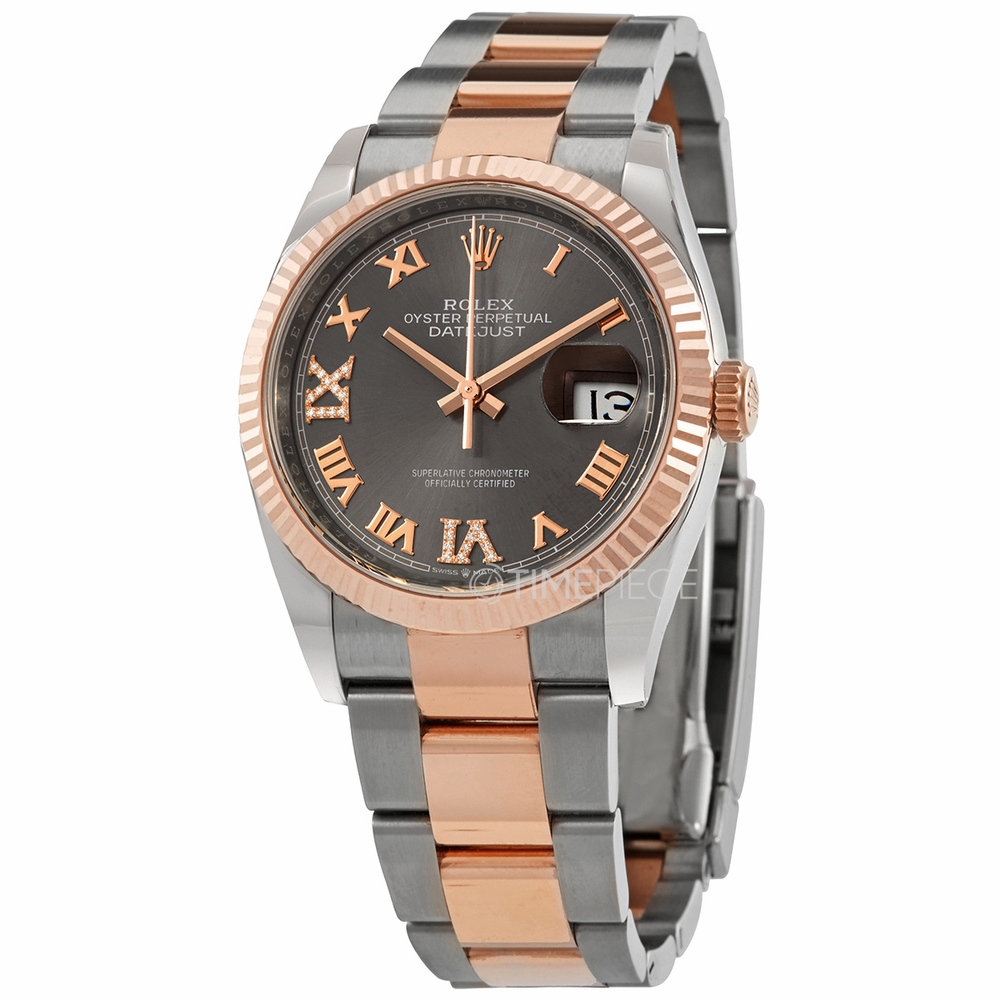 Stainless steel case with a stainless steel oyster bracelet with 18k everose gold center links. Fixed fluted 18kt everose gold bezel. Grey dial with 18k everose gold hands and Arabic numeral hour markers. Diamond-set Roman numeral appear at the 6 and 9 o'clock positions. Minute markers around the outer rim. Dial Type: Analog. Date display at the 3 o'clock position. Rolex calibre 3235 automatic movement, based upon Rolex 3035, containing 31 Jewels, bitting at 28800 vph, and has a power reserve of approximately 70 hours. Scratch resistant sapphire crystal. Screw down crown. Screw down case back. Round case shape. Case size: 36 mm. Folding clasp (with 5 mm comfort extension link). Water resistant at 100 meters / 330 feet. Functions: date, hour, minute, second, chronometer. Datejust 31 Series. Luxury watch style. Watch label: Swiss Made. Rolex Datejust 31 Automatic Diamond Grey Dial Watch 126231GYRDO.