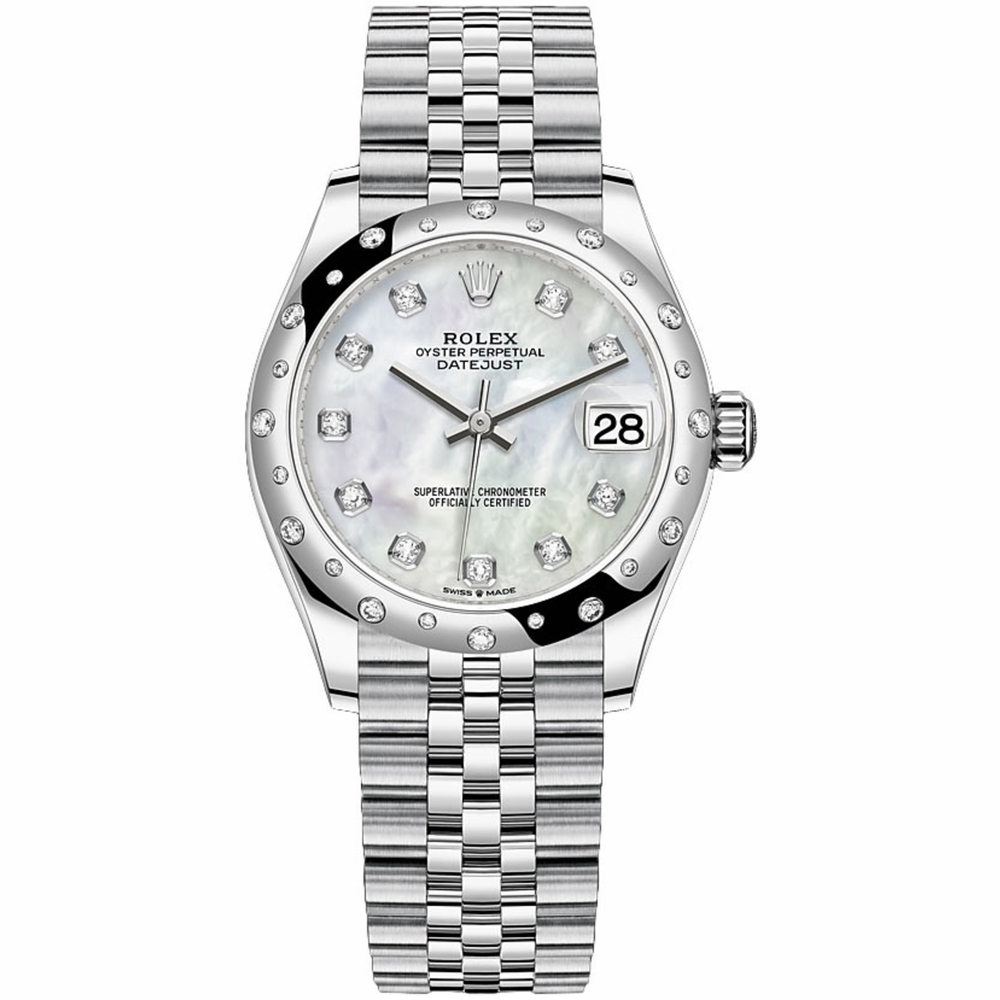 Silver-tone stainless steel/18k white gold case with a silver-tone stainless steel rolex jubilee bracelet. Silver-tone diamond set bezel. Mother of pearl dial with silver-tone hands and diamond hour markers. Dial Type: Analog. Date display at the 3 o'clock position. Rolex Calibre 2236 Automatic movement, based upon Rolex 2235, containing 31 Jewels, bitting at 28800 vph, and has a power reserve of approximately 55 hours. Screw down crown. Screw-down case back. Round case shape, case size: 31 mm. Folding clasp. Water resistant at 100 meters / 330 feet. Functions: date, hour, minute, second. Datejust 31 Series. Dress watch style. Watch label: Swiss Made. Rolex Datejust 31 Automatic Diamond Ladies Watch 278344MDJ.