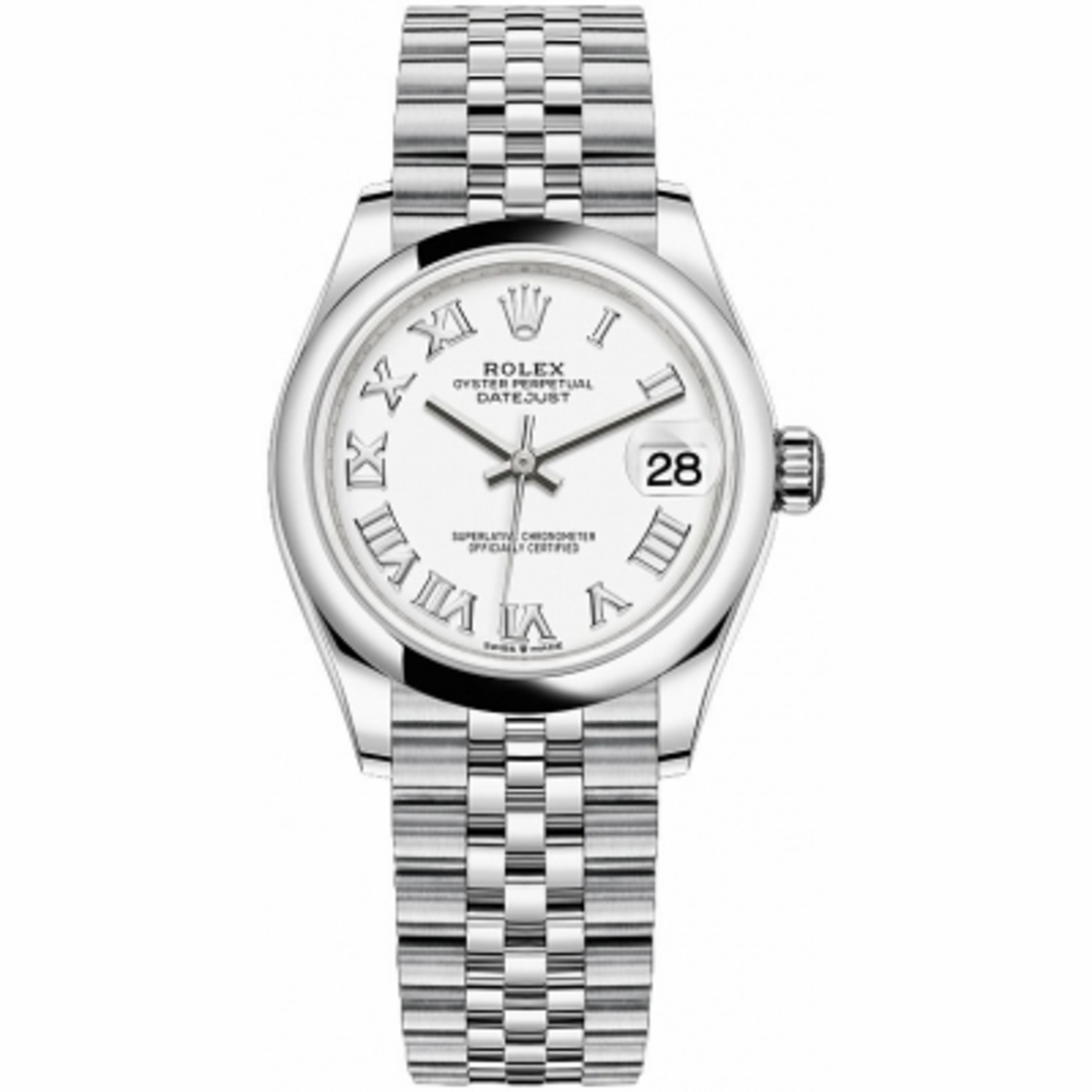 Silver-tone stainless steel case with a silver-tone stainless steel rolex jubilee bracelet. Silver-tone stainless steel bezel. White dial with silver-tone hands and Roman numeral hour markers. Dial Type: Analog. Date display at the 3 o'clock position. Rolex Calibre 2236 Automatic movement, based upon Rolex 2235, containing 31 Jewels, bitting at 28800 vph, and has a power reserve of approximately 55 hours. Scratch resistant sapphire crystal. Screw down crown. Screw-down case back. Round case shape, case size: 31 mm. Folding clasp. Water resistant at 100 meters / 330 feet. Functions: date, hour, minute, second. Datejust 31 Series. Watch label: Swiss Made. Rolex Datejust 31 Automatic White Dial Ladies Watch 278240WRJ.