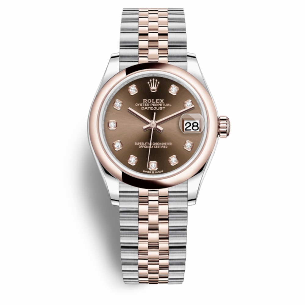 Silver-tone stainless steel case with a two-tone (silver-tone and rose gold-tone) stainless steel and 18kt everose gold jubilee bracelet. Domed 18kt everose gold bezel. Chocolate dial with everose gold hands and diamonds hour markers. Dial Type: Analog. Date display at the 3 o'clock position. Rolex Calibre 2236 Automatic movement, based upon Rolex 2235, containing 31 Jewels, bitting at 28800 vph, and has a power reserve of approximately 55 hours. Scratch resistant sapphire crystal. Screw down crown. Solid case back. Round case shape, case size: 31 mm. Folding clasp. Water resistant at 100 meters / 330 feet. Functions: date, hour, minute, second. Datejust 31 Series. Luxury watch style. Watch label: Swiss Made. Rolex Datejust 31 Chocolate Diamond Dial Automatic Steel and 18kt Everose Gold Jubilee Watch 278241CHDJ.