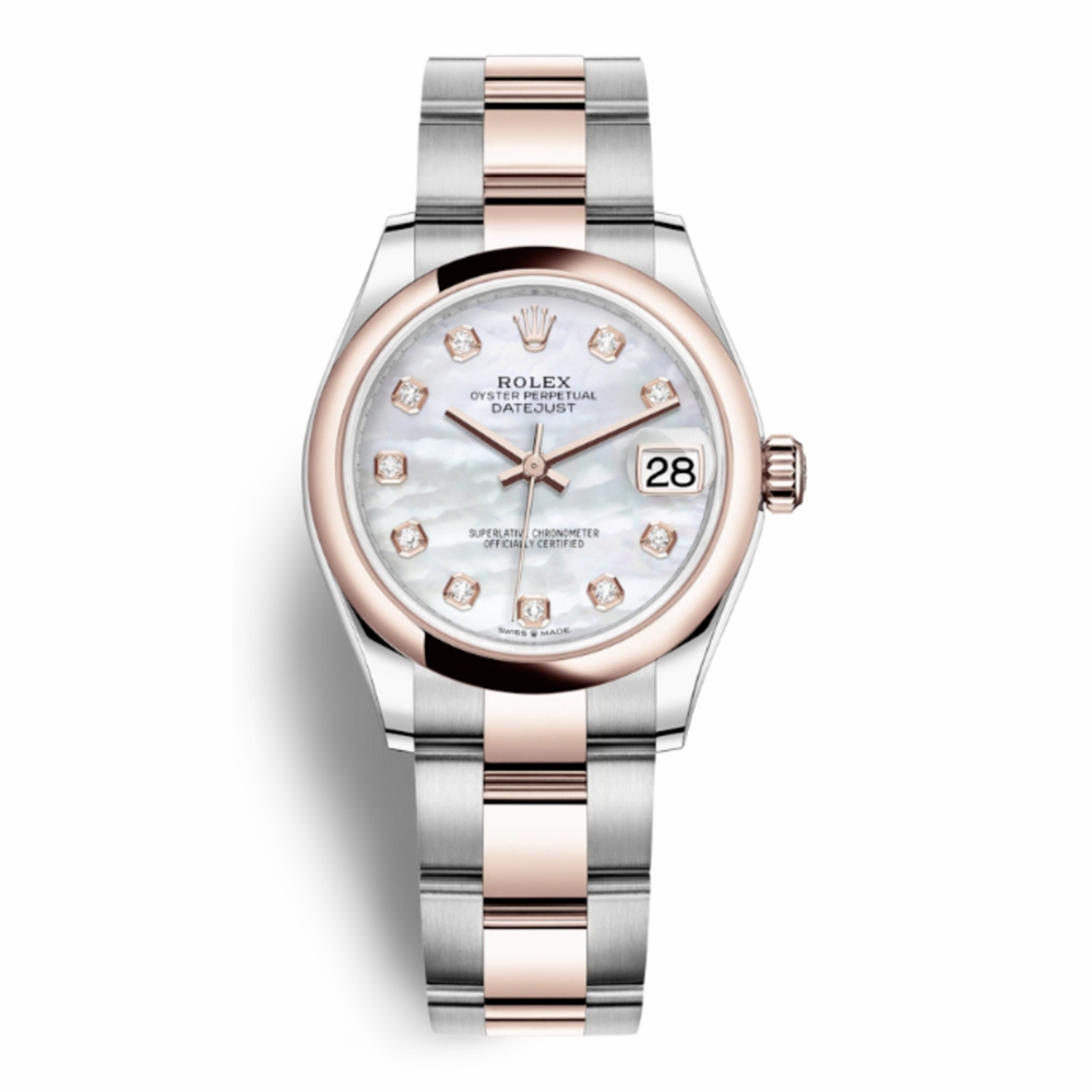 Silver-tone stainless steel case with a two-tone (silver-tone and rose gold-tone) stainless steel and 18kt everose gold jubilee bracelet. Domed 18kt everose gold bezel. Mother of pearl dial with everose gold hands and diamonds hour markers. Dial Type: Analog. Date display at the 3 o'clock position. Rolex Calibre 2236 Automatic movement, based upon Rolex 2235, containing 31 Jewels, bitting at 28800 vph, and has a power reserve of approximately 55 hours. Scratch resistant sapphire crystal. Screw down crown. Solid case back. Round case shape, case size: 31 mm. Folding clasp. Water resistant at 100 meters / 330 feet. Functions: date, hour, minute, second. Datejust 31 Series. Luxury watch style. Watch label: Swiss Made. Rolex Datejust 31 Mother of Pearl Dial Automatic Ladies Steel and 18kt Everose Gold Oyster Watch 278241MDO.