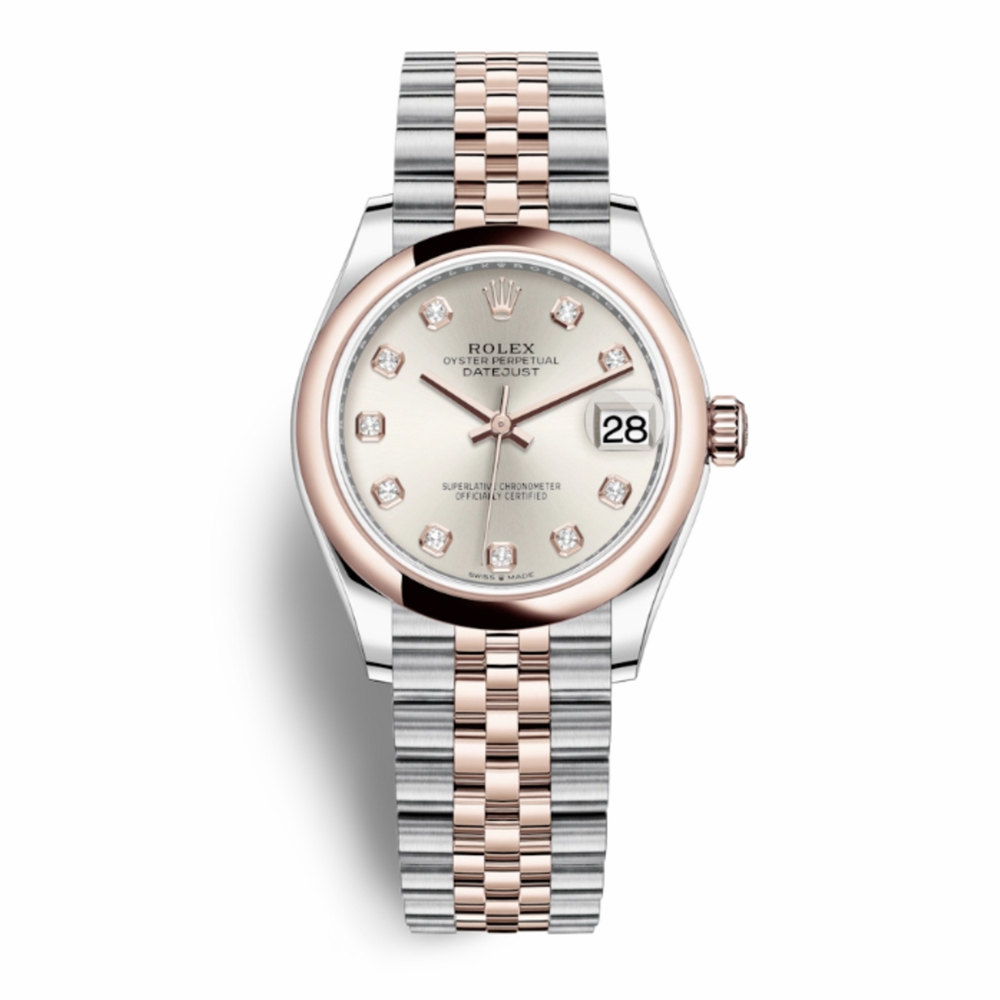 Silver-tone stainless steel case with a two-tone (silver-tone and rose gold-tone) stainless steel and 18kt everose gold jubilee bracelet. Domed rose gold-tone 8kt everose gold bezel. Silver dial with everose gold hands and diamond hour markers. Dial Type: Analog. Date display at the 3 o'clock position. Rolex Calibre 2236 Automatic movement, based upon Rolex 2235, containing 31 Jewels, bitting at 28800 vph, and has a power reserve of approximately 55 hours. Scratch resistant sapphire crystal. Screw down crown. Solid case back. Round case shape, case size: 31 mm. Folding clasp. Water resistant at 100 meters / 330 feet. Functions: date, hour, minute, second. Datejust 31 Series. Luxury watch style. Watch label: Swiss Made. Rolex Datejust 31 Silver Diamond Dial Automatic Steel and 18kt Everose Gold Jubilee Watch 278241SDJ.