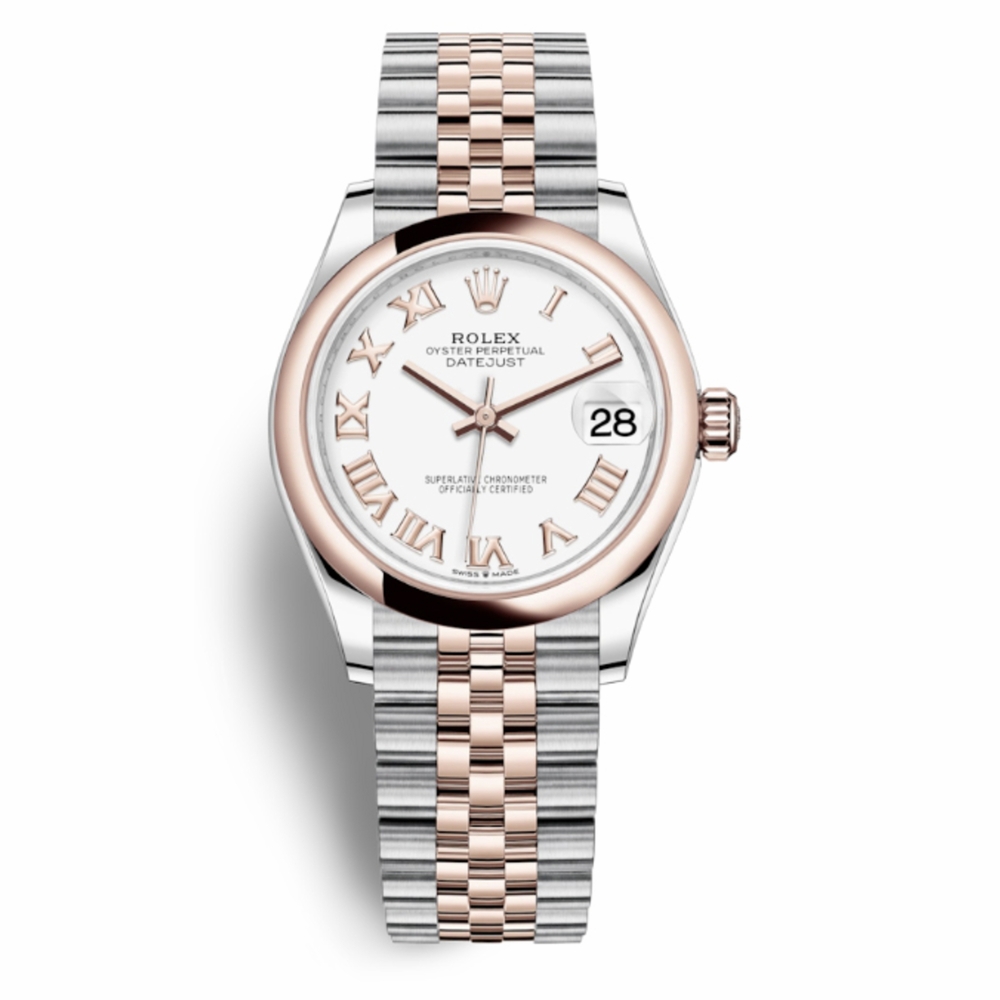 Silver-tone stainless steel case with a two-tone (silver-tone and rose gold-tone) stainless steel and 18kt everose gold jubilee bracelet. Domed 18kt everose gold bezel. White dial with everose gold hands and Roman numeral hour markers. Dial Type: Analog. Date display at the 3 o'clock position. Rolex Calibre 2236 Automatic movement, based upon Rolex 2235, containing 31 Jewels, bitting at 28800 vph, and has a power reserve of approximately 55 hours. Scratch resistant sapphire crystal. Screw down crown. Solid case back. Round case shape, case size: 31 mm. Folding clasp. Water resistant at 100 meters / 330 feet. Functions: date, hour, minute, second. Datejust 31 Series. Luxury watch style. Watch label: Swiss Made. Rolex Datejust 31 White Dial Automatic Steel and 18kt Everose Gold Jubilee Watch 278241WRJ.