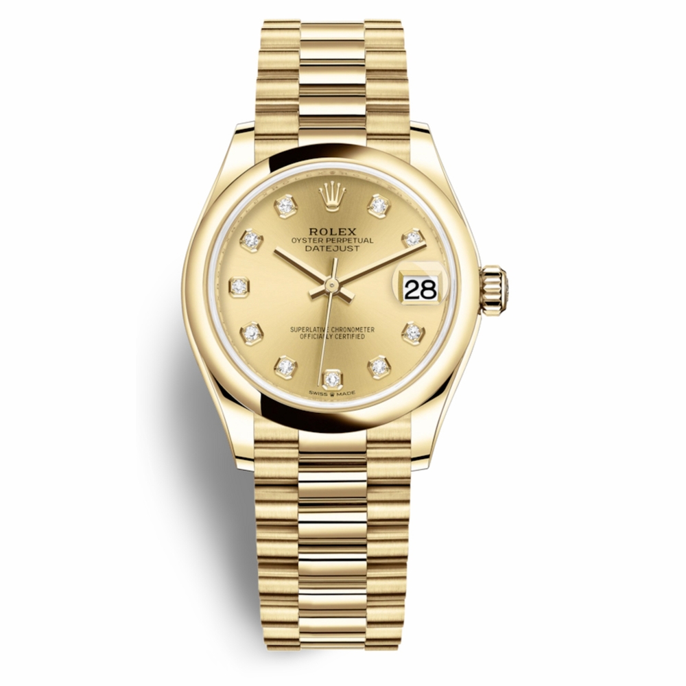 18kt yellow gold case with a 18kt yellow gold rolex president bracelet. Fixed 18kt yellow gold bezel. Champagne dial with gold-tone hands and diamond hour markers. Dial Type: Analog. Date display at the 3 o'clock position. Rolex Calibre 2236 Automatic movement, based upon Rolex 2235, containing 31 Jewels, bitting at 28800 vph, and has a power reserve of approximately 55 hours. Scratch resistant sapphire crystal. Screw down crown. Solid case back. Round case shape. Case size: 31 mm. Water resistant at 100 meters / 330 feet. Functions: date, hour, minute, second. Luxury watch style. Watch label: Swiss Made. Rolex Datejust 31 Champagne Diamond Dial Automatic 18kt Yellow Gold Rolex President Watch 278248CDP.