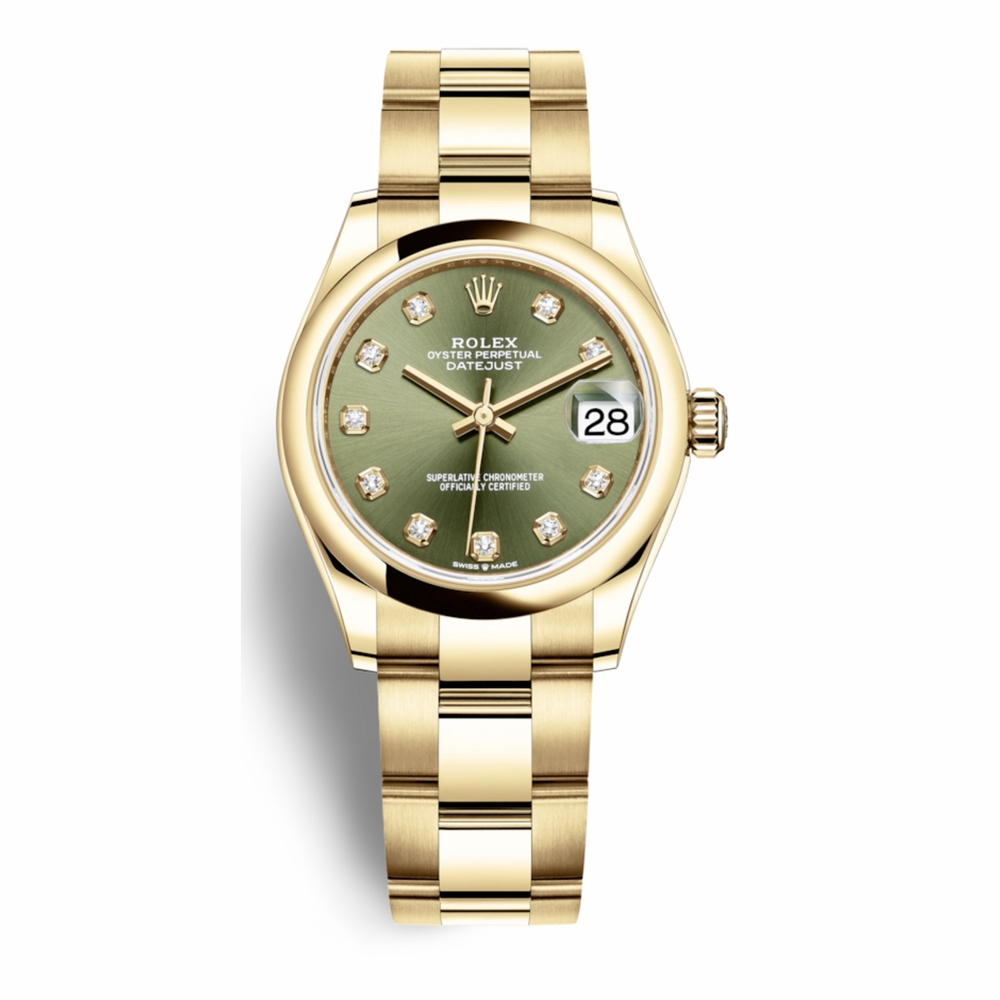 18kt yellow gold case with a 18kt yellow gold rolex oyster bracelet. Fixed 18kt yellow gold bezel. Olive green dial with gold-tone hands and diamond hour markers. Dial Type: Analog. Date display at the 3 o'clock position. Rolex Calibre 2236 Automatic movement, based upon Rolex 2235, containing 31 Jewels, bitting at 28800 vph, and has a power reserve of approximately 55 hours. Scratch resistant sapphire crystal. Screw down crown. Solid case back. Round case shape. Case size: 31 mm. Water resistant at 100 meters / 330 feet. Functions: date, hour, minute, second. Luxury watch style. Watch label: Swiss Made. Rolex Datejust 31 Olive Green Diamond Dial Automatic Ladies 18kt Yellow Gold Oyster Watch 278248GNDO.