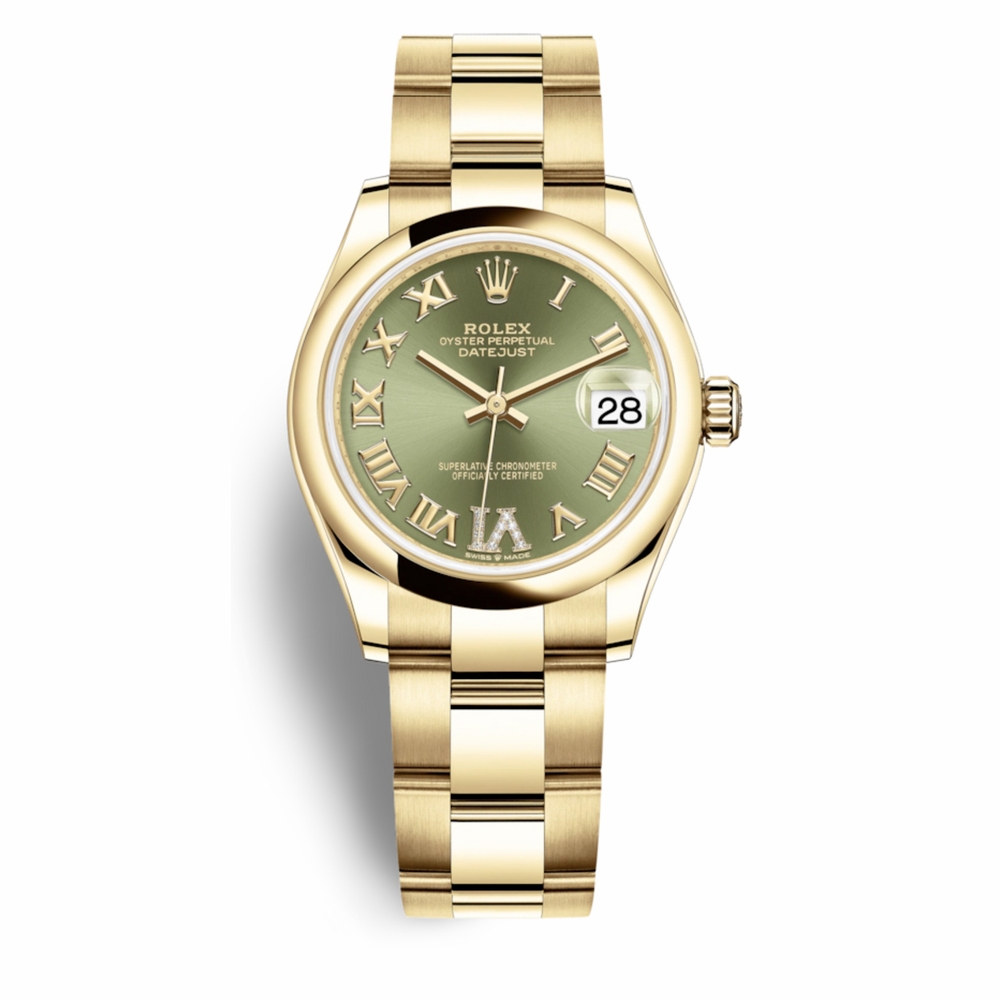 18kt yellow gold case with a 18kt yellow gold rolex oyster bracelet. Fixed 18kt yellow gold bezel. Olive green dial with gold-tone hands and Roman- diamond numerals hour markers. Dial Type: Analog. Date display at the 3 o'clock position. Rolex Calibre 2236 Automatic movement, based upon Rolex 2235, containing 31 Jewels, bitting at 28800 vph, and has a power reserve of approximately 55 hours. Scratch resistant sapphire crystal. Screw down crown. Solid case back. Round case shape. Case size: 31 mm. Water resistant at 100 meters / 330 feet. Functions: date, hour, minute, second. Luxury watch style. Watch label: Swiss Made. Rolex Datejust 31 Olive Green Dial Automatic Ladies 18kt Yellow Gold Oyster Watch 278248GNRDO.