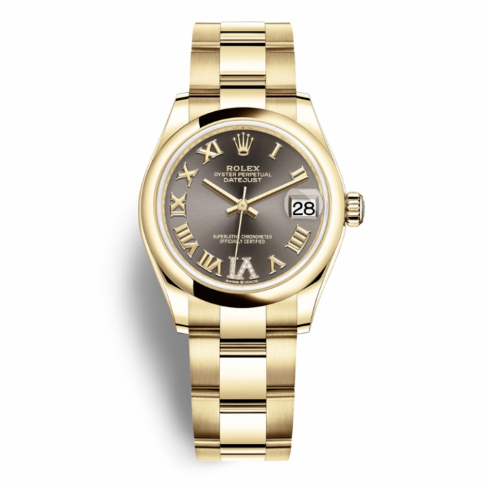 18kt yellow gold case with a 18kt yellow gold rolex oyster bracelet. Fixed 18kt yellow gold bezel. Dark grey dial with gold-tone hands and Roman- diamond numeral hour markers. Dial Type: Analog. Date display at the 3 o'clock position. Rolex Calibre 2236 Automatic movement, based upon Rolex 2235, containing 31 Jewels, bitting at 28800 vph, and has a power reserve of approximately 55 hours. Scratch resistant sapphire crystal. Screw down crown. Solid case back. Round case shape. Case size: 31 mm. Water resistant at 100 meters / 330 feet. Functions: date, hour, minute, second. Luxury watch style. Watch label: Swiss Made. Rolex Datejust 31 Dark Grey Diamond Dial Ladies 18kt Yellow Gold Oyster Watch 278248GYRDO.