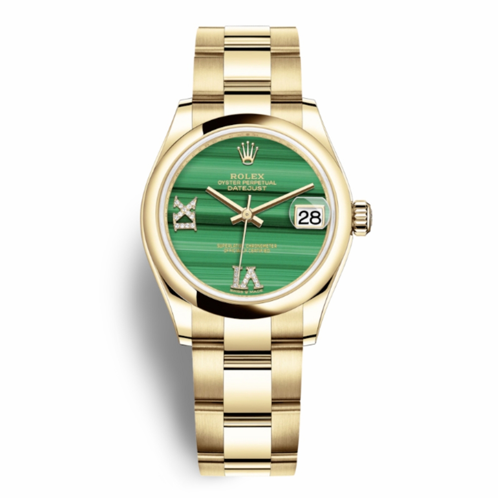 18kt yellow gold case with a 18kt yellow gold rolex oyster bracelet. Fixed 18kt yellow gold bezel. Malachite dial with Roman- diamond numeral hour markers. Dial Type: Analog. Date display at the 3 o'clock position. Rolex Calibre 2236 Automatic movement, based upon Rolex 2235, containing 31 Jewels, bitting at 28800 vph, and has a power reserve of approximately 55 hours. Scratch resistant sapphire crystal. Screw down crown. Solid case back. Round case shape. Case size: 31 mm. Water resistant at 100 meters / 330 feet. Functions: date, hour, minute, second. Luxury watch style. Watch label: Swiss Made. Rolex Datejust 31 Malachite Diamond Dial Ladies 18kt Yellow Gold Oyster Watch 278248MLRDO.