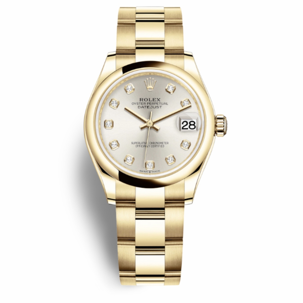 18kt yellow gold case with a 18kt yellow gold rolex oyster bracelet. Fixed 18kt yellow gold bezel. Silver dial with gold-tone hands and diamond hour markers. Dial Type: Analog. Date display at the 3 o'clock position. Rolex Calibre 2236 Automatic movement, based upon Rolex 2235, containing 31 Jewels, bitting at 28800 vph, and has a power reserve of approximately 55 hours. Scratch resistant sapphire crystal. Screw down crown. Solid case back. Round case shape. Case size: 31 mm. Water resistant at 100 meters / 330 feet. Functions: date, hour, minute, second. Luxury watch style. Watch label: Swiss Made. Rolex Datejust 31 Silver Diamond Dial Automatic Ladies 18kt Yellow Gold Oyster Watch 278248SDO.