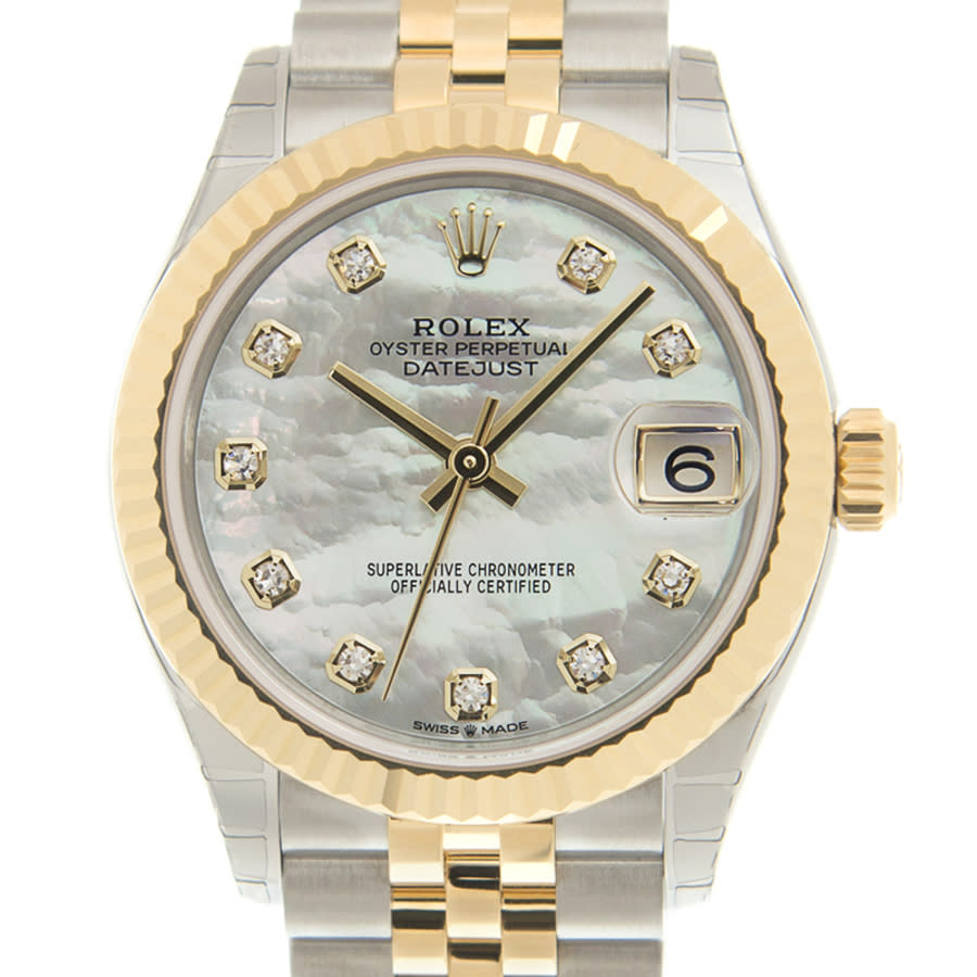 Stainless steel and 18kt yellow gold case with a stainless steel and 18kt yellow gold jubilee bracelet. Fixed-fluted bezel. Mother of pearl dial with yellow gold hands and diamond hour markers. Dial Type: Analog. Date display at the 3 o'clock position. Rolex Calibre 2236 automatic movement with a 55-hour power reserve. Scratch resistant sapphire crystal. Screw down crown. Solid case back. Round case shape. Case size: 31 mm. Water resistant at 100 meters / 330 feet. Functions: date, hour, minute, second. Luxury watch style. Watch label: Swiss Made. Rolex Datejust 31 Mother of Pearl Diamond Dial Automatic Ladies Steel and 18kt Yellow Gold Jubilee Watch 278273MDJ.