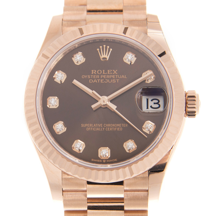 18kt everose gold case with a 18kt everose gold rolex president bracelet. Fixed-fluted 18kt everose gold bezel. Chocolate dial with everose gold hands and diamonds hour markers. Dial Type: Analog. Date display at the 3 o'clock position. Rolex Calibre 2236 automatic movement with a 55-hour power reserve. Scratch resistant sapphire crystal. Screw down crown. Solid case back. Round case shape. Case size: 31 mm. Water resistant at 100 meters / 330 feet. Functions: date, hour, minute, second. Luxury watch style. Watch label: Swiss Made. Rolex Datejust 31 Chocolate Diamond Dial Ladies 18kt Everose Gold President Watch 278275CHDP.