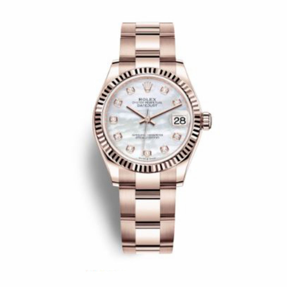 18kt everose gold case with a 18kt everose gold rolex oyster bracelet. Fixed-fluted 18kt everose gold bezel. Mother of pearl dial with everose gold hands and diamonds hour markers. Dial Type: Analog. Date display at the 3 o'clock position. Rolex Calibre 2236 automatic movement with a 55-hour power reserve. Scratch resistant sapphire crystal. Screw down crown. Solid case back. Round case shape. Case size: 31 mm. Water resistant at 100 meters / 330 feet. Functions: date, hour, minute, second. Luxury watch style. Watch label: Swiss Made. Rolex Datejust 31 Mother of Pearl Diamond Dial Ladies 18kt Everose Gold Oyster Watch 278275MDO.