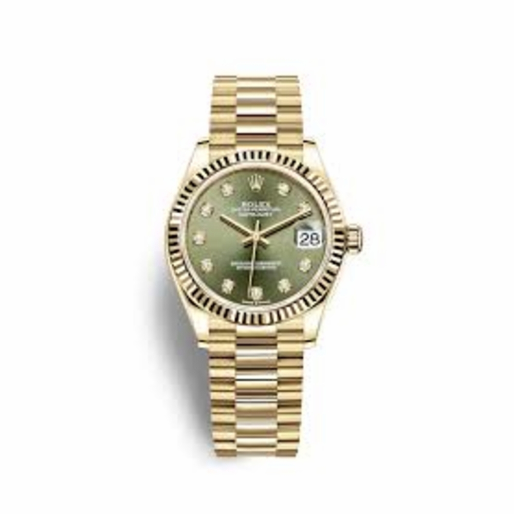 18kt yellow gold case with a 18kt yellow gold rolex president bracelet. Fixed-fluted bezel. Olive green dial with yellow gold hands and diamond hour markers. Dial Type: Analog. Date display at the 3 o'clock position. Rolex Calibre 2236 automatic movement with a 55-hour power reserve. Scratch resistant sapphire crystal. Screw down crown. Solid case back. Round case shape. Case size: 31 mm. Water resistant at 100 meters / 330 feet. Functions: date, hour, minute, second. Luxury watch style. Watch label: Swiss Made. Rolex Datejust 31 Olive Green Diamond Dial Ladies 18kt Yellow Gold President Watch 278278GNDP.