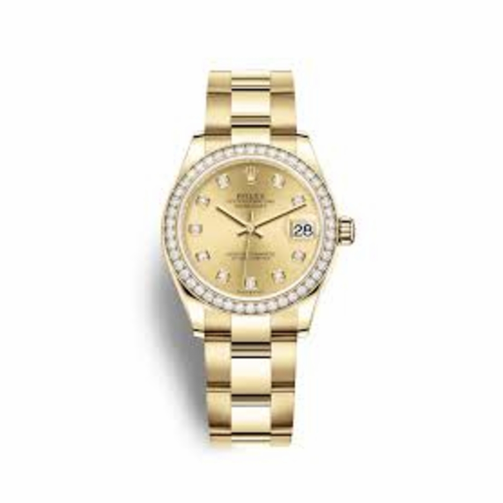 18kt yellow gold case with a 18kt yellow gold rolex oyster bracelet. Fixed bezel. Champagne dial with yellow gold hands and diamonds hour markers. Dial Type: Analog. Date display at the 3 o'clock position. Rolex Calibre 2236 automatic movement. Scratch resistant sapphire crystal. Screw down crown. Solid case back. Round case shape. Case size: 31 mm. Water resistant at 100 meters / 330 feet. Functions: date, hour, minute, second. Luxury watch style. Watch label: Swiss Made. Rolex Datejust 31 Champagne Diamond Dial Automatic Ladies 18kt Yellow Gold Oyster Watch 278288CDO.