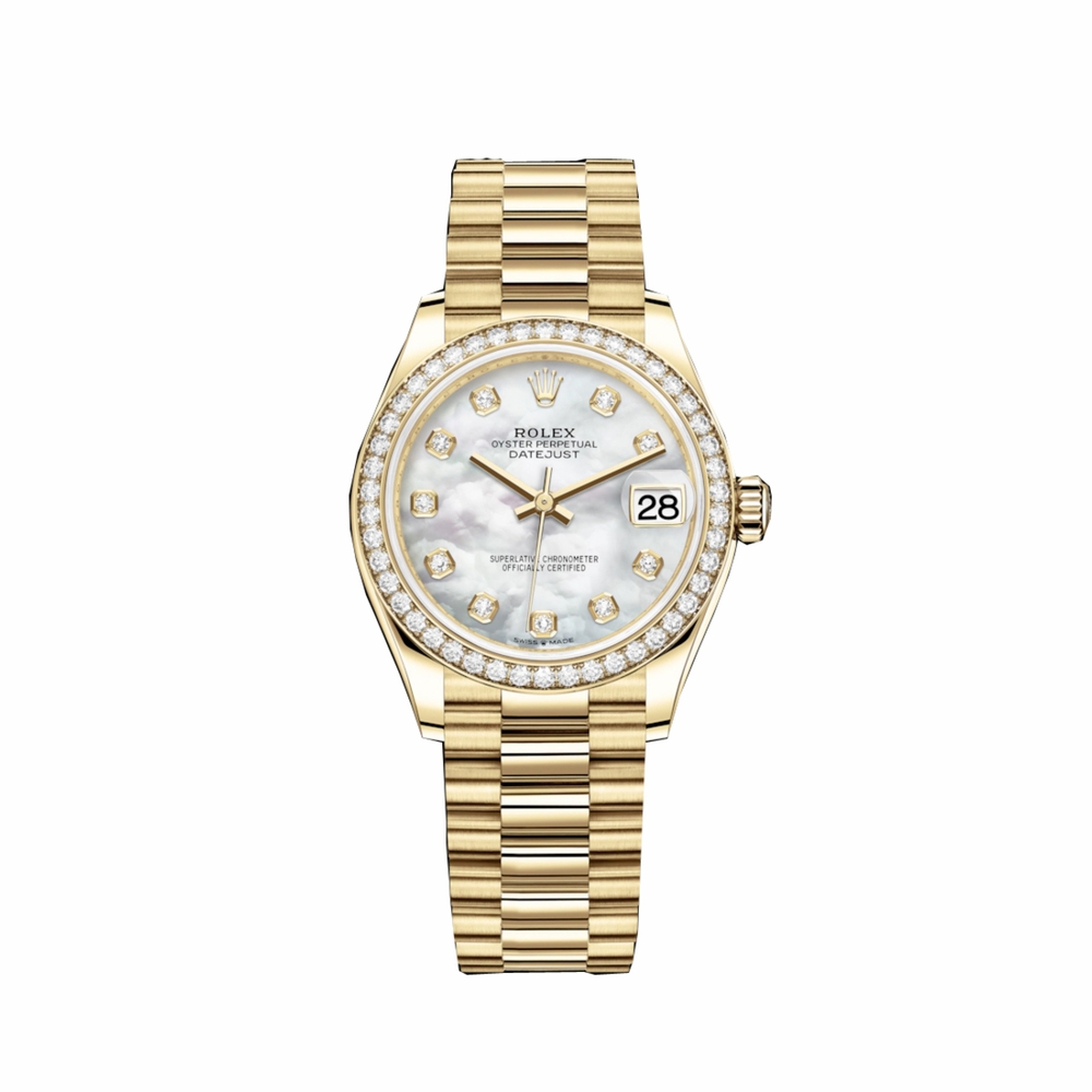 18kt yellow gold case with a 18kt yellow gold rolex president bracelet. Fixed-diamond set bezel. Mother of pearl dial with yellow gold hands and diamond hour markers. Dial Type: Analog. Date display at the 3 o'clock position. Rolex Calibre 2236 automatic movement with a 55-hour power reserve. Scratch resistant sapphire crystal. Screw down crown. Solid case back. Round case shape. Case size: 31 mm. Water resistant at 100 meters / 330 feet. Functions: date, hour, minute, second. Luxury watch style. Watch label: Swiss Made. Rolex Datejust 31 Mother of Pearl Diamond Ladies 18kt Yellow Gold President Watch 278288MDP.