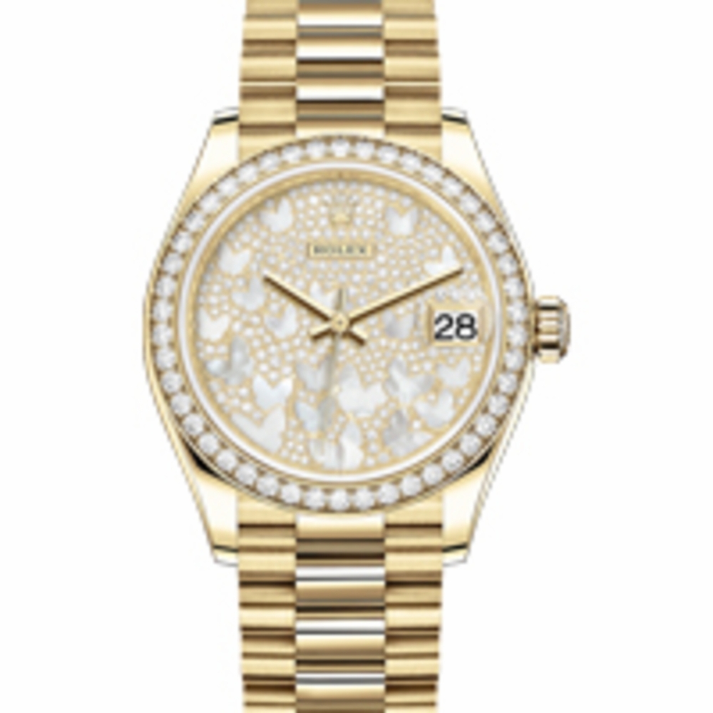 18kt yellow gold case with a 18kt yellow gold rolex president bracelet. Fixed-diamond set bezel. Mother of pearl butterfly, paved dial with yellow gold hands. Dial Type: Analog. Date display at the 3 o'clock position. Rolex Calibre 2236 automatic movement with a 55-hour power reserve. Scratch resistant sapphire crystal. Screw down crown. Solid case back. Round case shape. Case size: 31 mm. Water resistant at 100 meters / 330 feet. Functions: date, hour, minute, second. Luxury watch style. Watch label: Swiss Made. Rolex Datejust 31 Mother of Pearl Butterfly Diamond Dial Ladies President Watch 278288PAVEP.