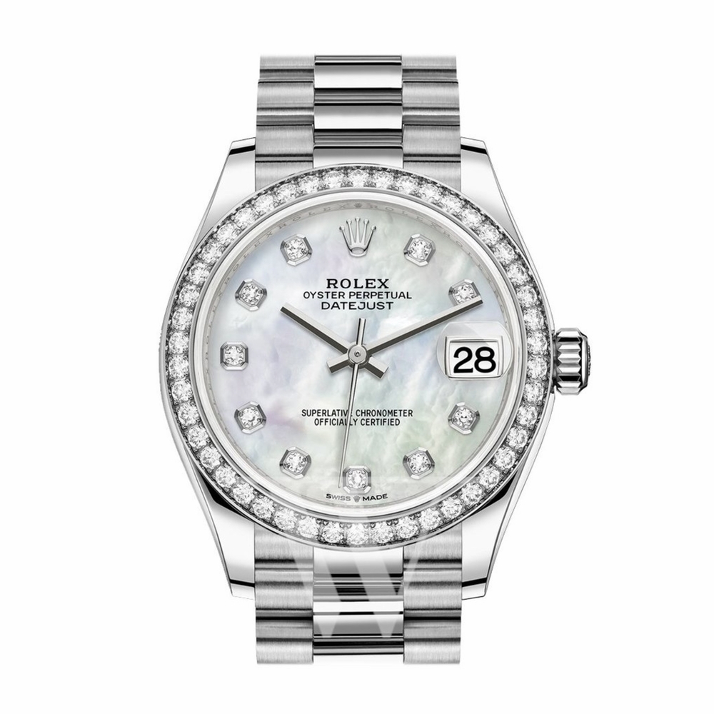 18kt white gold case with a 18kt white gold rolex president bracelet. Fixed-diamond set bezel. Mother of pearl dial with silver-tone hands and diamonds hour markers. Dial Type: Analog. Date display at the 3 o'clock position. Rolex Calibre 2236 automatic movement with a 55-hour power reserve. Scratch resistant sapphire crystal. Screw down crown. Solid case back. Round case shape. Case size: 31 mm. Water resistant at 100 meters / 330 feet. Functions: date, hour, minute, second. Luxury watch style. Watch label: Swiss Made. Rolex Datejust 31 Mother of Pearl Diamond Dial Ladies 18kt White Gold President Watch 278289MDP.
