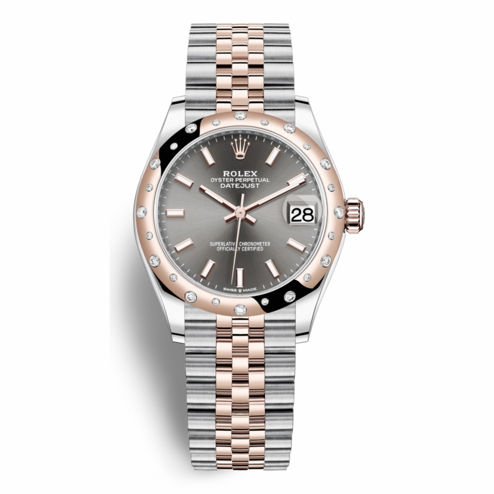 Stainless steel and 18kt everose gold case with a two-tone (silver-tone and rose gold-tone) stainless steel and 18kt everose gold jubilee bracelet. Fixed- domed 18kt everose gold diamond set bezel. Dark rhodium dial with everose gold hands and index hour markers. Dial Type: Analog. Date display at the 3 o'clock position. Rolex Calibre 2236 Automatic movement, based upon Rolex 2235, containing 31 Jewels, bitting at 28800 vph, and has a power reserve of approximately 55 hours. Scratch resistant sapphire crystal. Screw down crown. Solid case back. Round case shape, case size: 31 mm. Water resistant at 100 meters / 330 feet. Functions: date, hour, minute, second. Datejust 31 Series. Luxury watch style. Watch label: Swiss Made. Rolex Datejust 31 Dark Rhodium Automatic Diamond Ladies Watch 278341DRSJ.