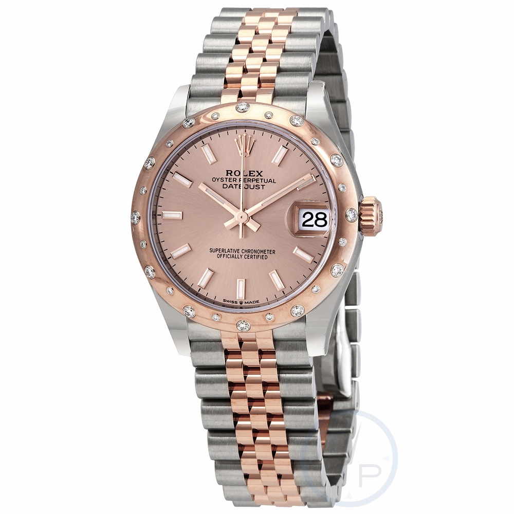 Stainless steel case with a stainless steel Rolex jubilee bracelet with 18kt everose gold center links. Domed 18kt everose gold bezel set with diamonds. Rose dial with luminousn everose gold hands and index hour markers. Dial Type: Analog. Luminescent hands and markers. Date display at the 3 o'clock position. Rolex calibre 2236 automatic movement, based upon Rolex 2235, containing 31 Jewels, bitting at 28800 vph, and has a power reserve of approximately 55 hours. Scratch resistant sapphire crystal. Screw down crown. Solid case back. Round case shape. Case size: 31 mm. Folding oyster clasp. Water resistant at 100 meters / 330 feet. Functions: date, hour, minute, second. Dress watch style. Watch label: Swiss Made. Rolex DateJust 31 Rose Dial Automatic Ladies Stainless Steel 18kt Everose Gold Jubliee Watch 278341PSJ.