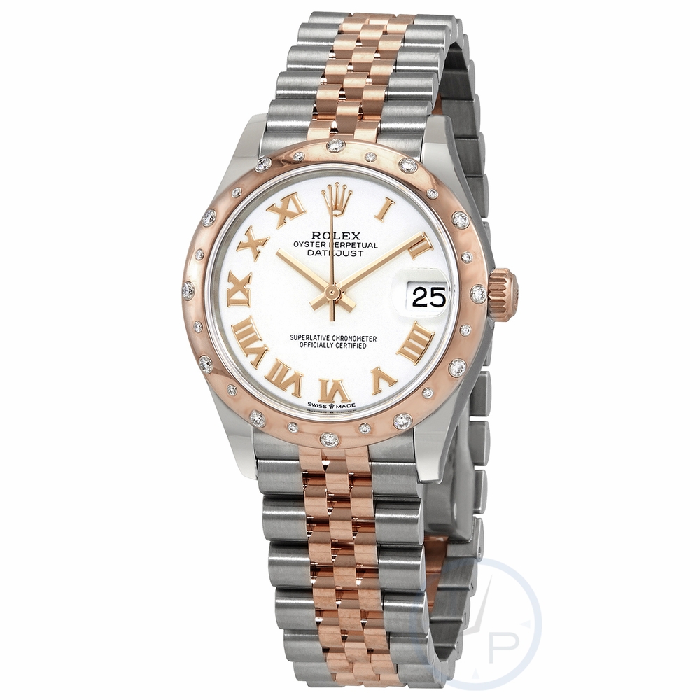 Stainless steel case with a stainless steel jubilee bracelet with 18kt everose gold center links. Fixed 18kt everose gold bezel set with diamonds. White dial with everose gold hands and Roman numeral hour markers. Dial Type: Analog. Date display at the 3 o'clock position. Rolex calibre 2236 automatic movement, based upon Rolex 2235, containing 31 Jewels, bitting at 28800 vph, and has a power reserve of approximately 55 hours. Scratch resistant sapphire crystal. Screw down crown. Solid case back. Round case shape. Case size: 31 mm. Fold over clasp. Water resistant at 100 meters / 330 feet. Functions: date, hour, minute, second. Datejust 31 Series. Luxury watch style. Watch label: Swiss Made. Rolex Datejust 31 White Dial Ladies Steel and 18kt Everose Gold Jubilee Watch 278341WRJ.
