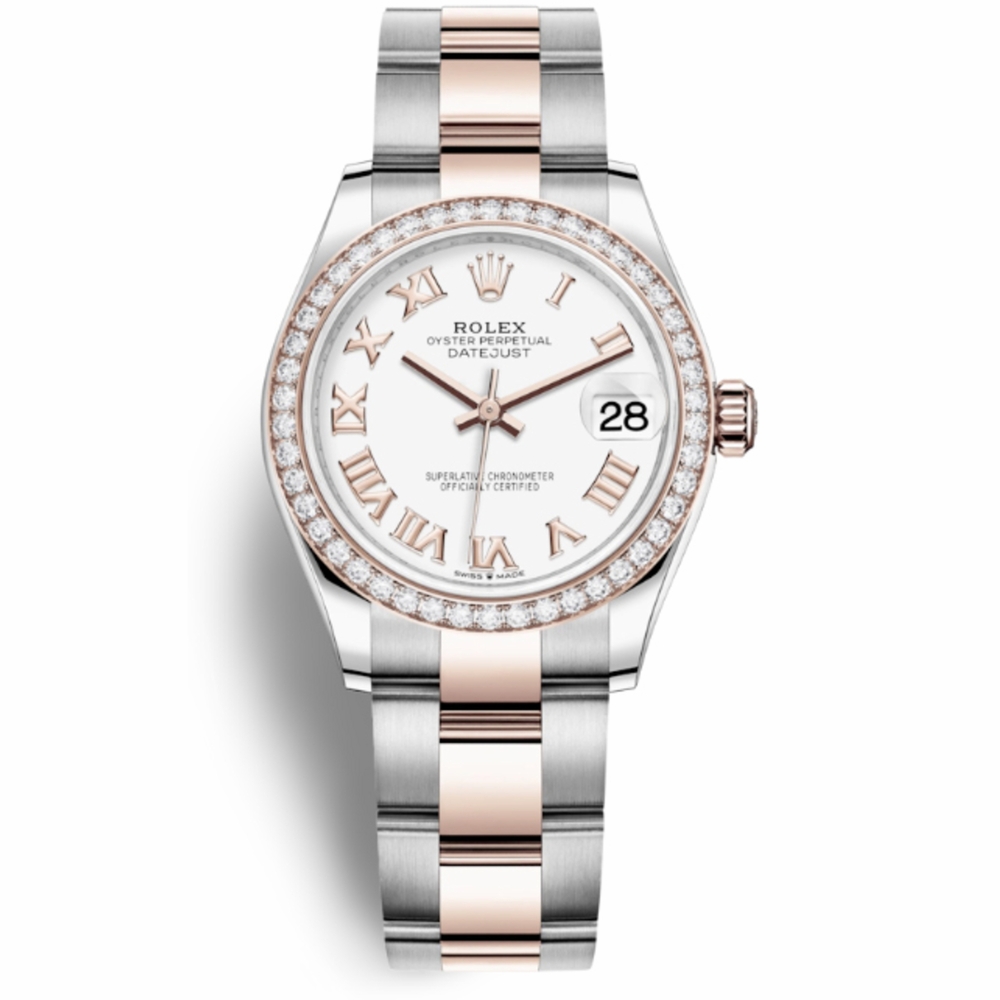 Stainless steel and 18kt everose gold case with a stainless steel and 18kt everose gold oyster bracelet. Fixed diamond set bezel. White dial with everose gold hands and Roman hour markers. Dial Type: Analog. Date display at the 3 o'clock position. Rolex Calibre 2236 Automatic movement, based upon Rolex 2235, containing 31 Jewels, bitting at 28800 vph, and has a power reserve of approximately 55 hours. Scratch resistant sapphire crystal. Screw down crown. Solid case back. Round case shape. Case size: 31 mm. Folding oyster clasp. Water resistant at 100 meters / 330 feet. Functions: date, hour, minute, second. Luxury watch style. Watch label: Swiss Made. Rolex Datejust White Dial Automatic Ladies Steel and Everose Gold Oyster Watch 278381WRO.