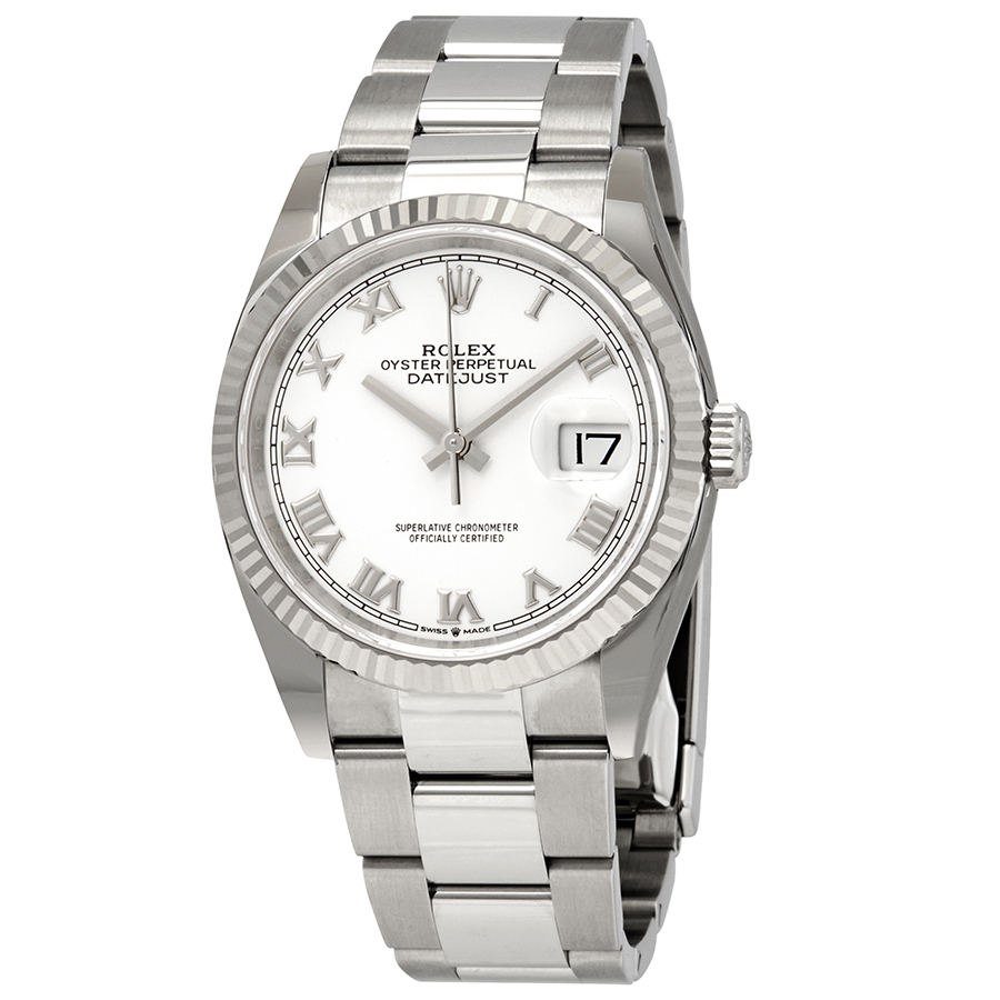 Stainless steel case with a stainless steel Rolex oyster bracelet. Fixed fluted 18kt white gold bezel. White dial with silver-tone hands and Roman numeral hour markers. Minute markers around the outer rim. Dial Type: Analog. Date display at the 3 o'clock position. Rolex calibre 3235 automatic movement, based upon Rolex 3035, containing 31 Jewels, bitting at 28800 vph, and has a power reserve of approximately 70 hours. Scratch resistant sapphire crystal. Screw down crown. Solid case back. Round case shape. Case size: 36 mm. Oysterlock clasp. Water resistant at 100 meters / 330 feet. Functions: date, hour, minute, second. Datejust 36 Series. Luxury watch style. Watch label: Swiss Made. Rolex Datejust 36 Automatic White Dial Ladies Oyster Watch 126234WRO.