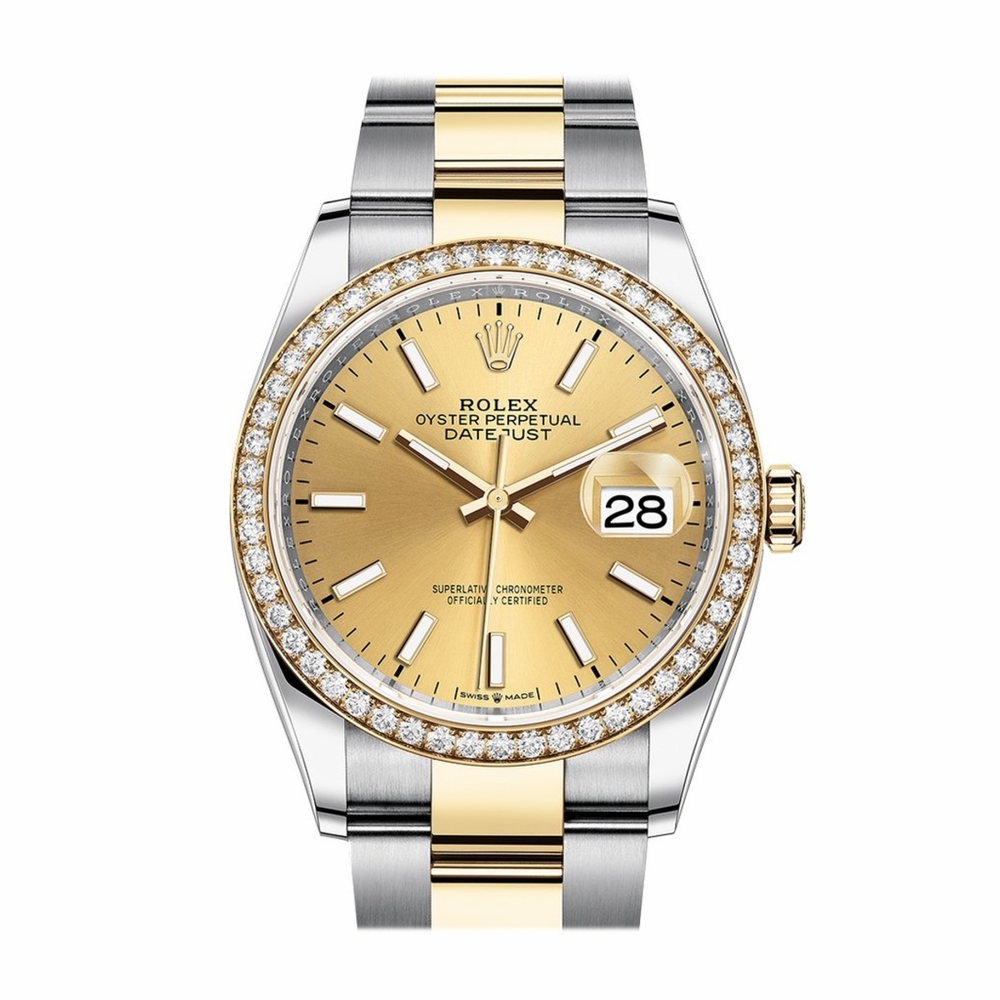 Stainless steel and 18kt yellow gold case with a stainless steel and 18kt yellow gold rolex oyster bracelet. Fixed-diamond set bezel. Champagne dial with yellow gold hands and index hour markers. Dial Type: Analog. Date display at the 3 o'clock position. Rolex Calibre 3235 automatic movement with a 70-hour power reserve. Scratch resistant sapphire crystal. Screw down crown. Solid case back. Round case shape. Case size: 36 mm. Water resistant at 100 meters / 330 feet. Functions: date, hour, minute, second. Luxury watch style. Watch label: Swiss Made. Rolex Datejust 36 Champagne Dial Mens Steel and 18kt Yellow Gold Oyster Watch 126283CSO.