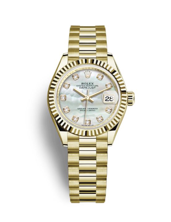 18kt yellow gold case with a 18kt yellow gold oyster bracelet. Fixed fluted yellow gold 18kt yellow gold bezel. White mother of pearl dial with yellow gold hands and diamond hour markers. Dial Type: Analog. Date display at the 3 o'clock position. Rolex Calibre 2236 Automatic movement, based upon Rolex 2235, containing 31 Jewels, bitting at 28800 vph, and has a power reserve of approximately 55 hours. Scratch resistant sapphire crystal. Screw down crown. Solid case back. Round case shape. Case size: 28 mm. Concealed folding crown clasp. Water resistant at 100 meters / 330 feet. Functions: date, hour, minute, second, chronometer. Luxury watch style. Watch label: Swiss Made. Rolex Lady Datejust Automatic Chronometer Diamond White Mother of Pearl Dial Ladies Watch 279178MDP.